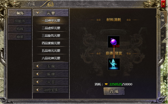 属于特殊的装备合成,类别有:元婴、斗笠,疗伤石、玉佩和勋章等。庄园-合成炼制老板和合成界面分别能找到,玩家需要参与限时活动获得材料进行锻造合成