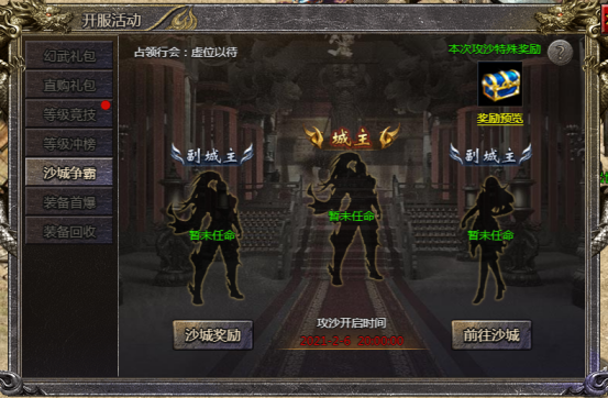 开服第五天开启沙巴克活动,之后固定周三周六开启。以行会为单位在限定时间内占领皇宫,赢取丰厚的占领奖励