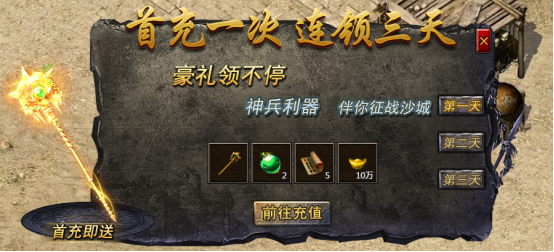 玩家首次充值任意金额就可连续三天领取超值大礼包,无级别武器、特殊装备、高级技能书,绝对不容错过