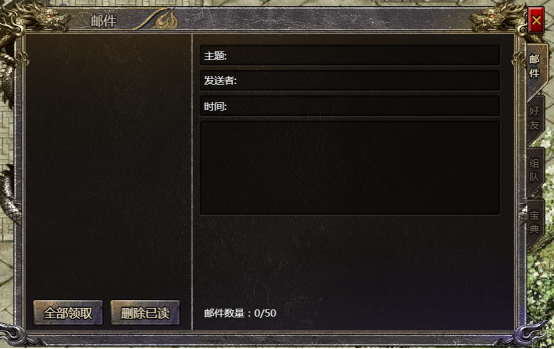 当玩家有新邮件时,则界面正左下角会有邮件图标闪烁提示玩家来查看邮件,当玩家点击邮件按钮后会显示邮件系统界面,点击该未读邮件,便可看见邮件信息,有的邮件带有附件奖励可领取,玩家也能一键领取所有邮件的附件。同时在没有新邮件时,在界面右侧的社交入口,也能查看历史邮件。